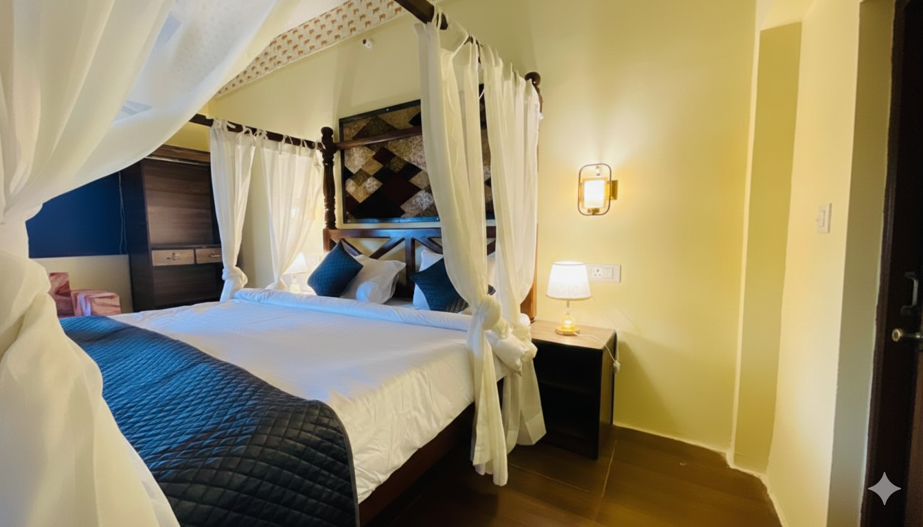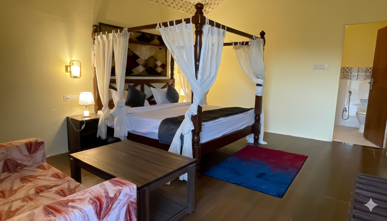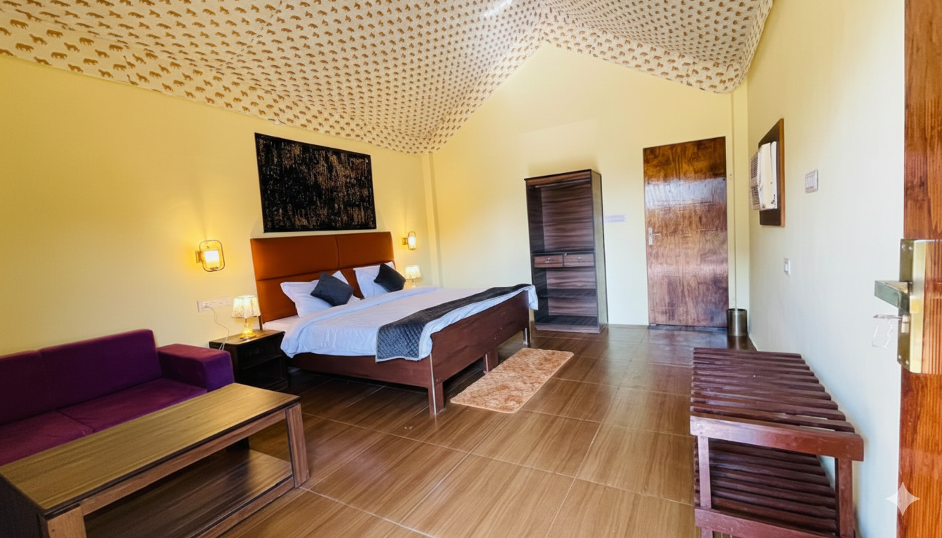 Designed for comfort and relaxation, the Deluxe Cottages feature warm interiors, cosy bedding, and a calm ambience. These cottages are perfect for families and couples looking for a peaceful stay close to Ranthambore National Park.